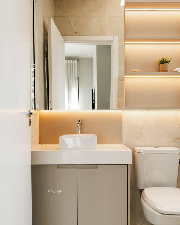 - Nichos embutidos, perfeitos para armazenar produtos de uso diário sem pesar na decoração;