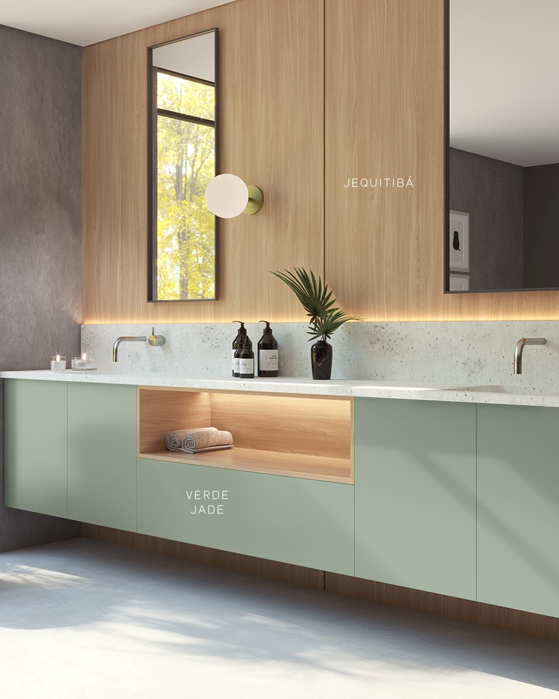 A ideia é trabalhar com um amplo balcão, feito com o padrão Verde Jade para dar um toque especial de frescor ao banheiro. O Jequitibá serve como um painel para receber o espelho e ajudar a decorar o espaço.